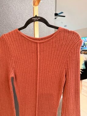 Slim-fitting ribbed maxi dress in warm rust. Long sleeves finish in flirty ruffle bell cuffs. Soft knit fabric for comfortable wear. Elegant silhouette for day or evening.