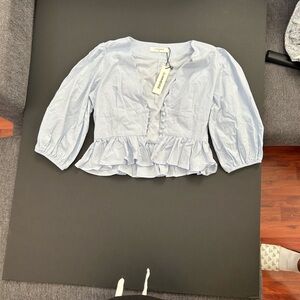 Elegant sky blue top with ruffle detail. Features a button-down front and three-quarter sleeves. Ideal for casual wear.