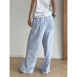 Commense Stripe Casual Loose Double Waisted Tie Front Pants Lounge Blue Stripe M