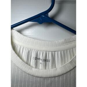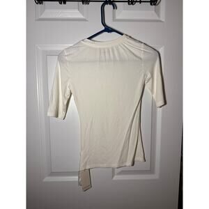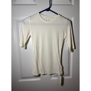 Cream Commense form-fitting shirt with 1/4 sleeve. Not really short sleeve, but not half sleeve or cap sleeve. Very cute for work, can dress up or down.