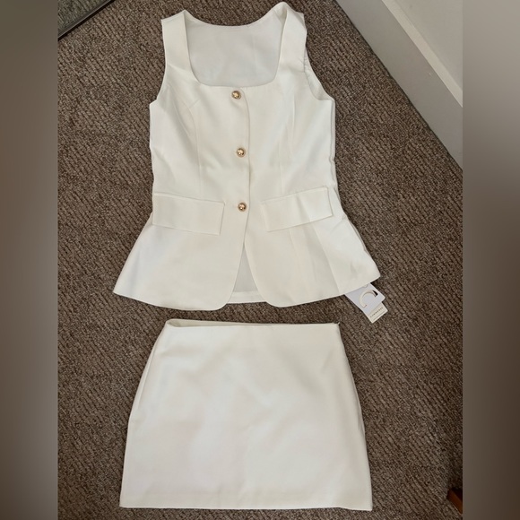 Sleeveless white top with a scoop neckline and gold-tone buttons down the front. Peplum hem with flap pockets. Structured skirt to complete the set for a polished silhouette. Versatile for work or events.