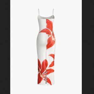 Elegant maxi dress with bold red floral design. Sleeveless with a fitted silhouette. Perfect for summer outings.