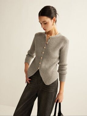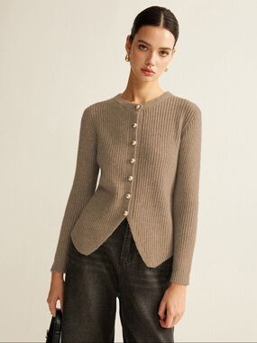 Ribbed knit cardigan with buttons. Round neckline and fitted long sleeves. Subtle scalloped hem for a feminine touch. Lightweight layer for everyday wear.