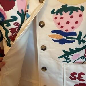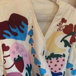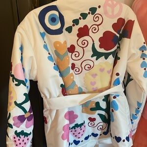 Colorful pattern. Never worn. Comes in Commense packaging. Removable belt. Button front.