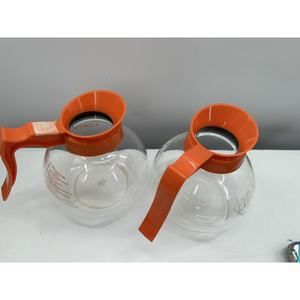 The product is a set of two 64 oz. decaf glass coffee pots/carafes/decanter replacements in an orange color, suitable for commercial use. It is designed for 12-cup capacity and is unbranded, making it versatile for various regions. The supply type indicates it is intended for use in restaurants, food service establishments, and other commercial settings.