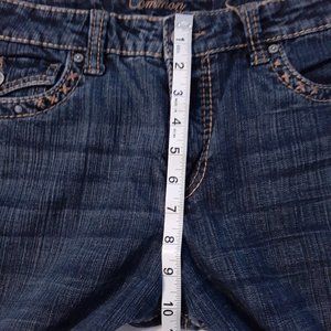 ▪️Description: Common Genes Dark Wash Women's/Junior's Flare Jeans. These are a bootcut flare style jean with button closures at back pockets, accented with detailed design. 2 pockets at front with one tiny secret button down pocket. Whiskering at the pocket/hip area. These jeans are stretchy and comfortable, perfect for back to school!