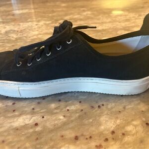 Step out in style with these sleek black canvas sneakers. Perfect for casual outings, these shoes offer comfort and durability. A must-have for any wardrobe. Light wear on left sneaker as shown; still a lot of life left!
