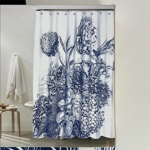 Elegant shower curtain with a blue and white botanical design. Perfect for adding a touch of nature to your bathroom decor.