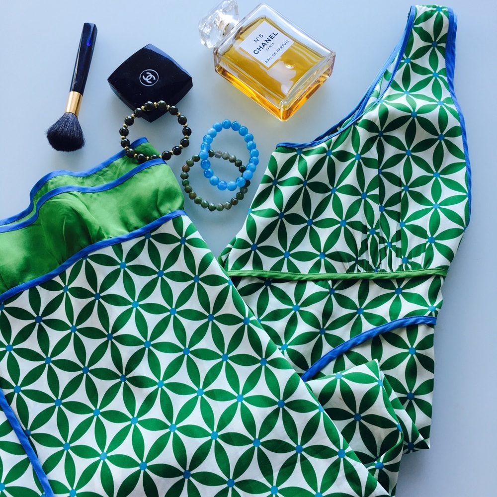 Lovely blue and green print on this sleeveless dress, with blue trim around to add a finishing touch. Very soft and comfortable. Please note at bottom green part a small pulled thread. This still doesn't take away from the perfect print and look of this dress.