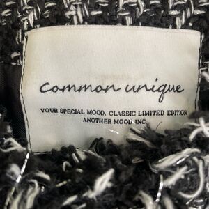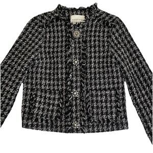 The Common Unique Tweed Fringe Trim Houndstooth Embellished Buttons Blazer in size S is a stylish and sophisticated piece of women's clothing. This short-length blazer features a classic fit with long sleeves and a button closure, making it perfect for formal occasions and parties. The black tweed fabric with plaid pattern, fringe accents, and embellished buttons add a touch of designer flair to the piece. Lined and collarless, this blazer is a fashionable choice for the winter and fall seasons.