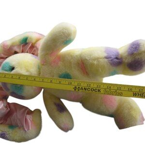 Yellow Easter bunny, so soft, cute and huggable. Has a colorful egg-shaped polka dots allover! Measures approximately 18" long.