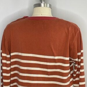 Such a unique sweater! White stripes against an orange background. The knit orange fabric has flecks of green in it. The cuffs, collar, and hem is a muted red color. White working buttons on the shoulder. Unfortunately the fabric tag is missing. Make this sweater yours this cozy sweater season.