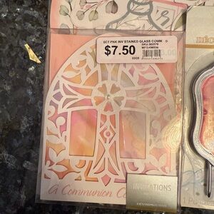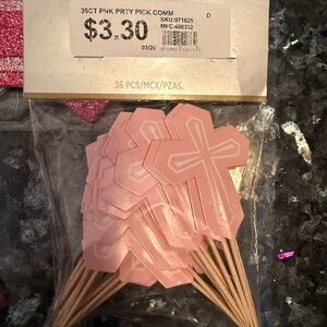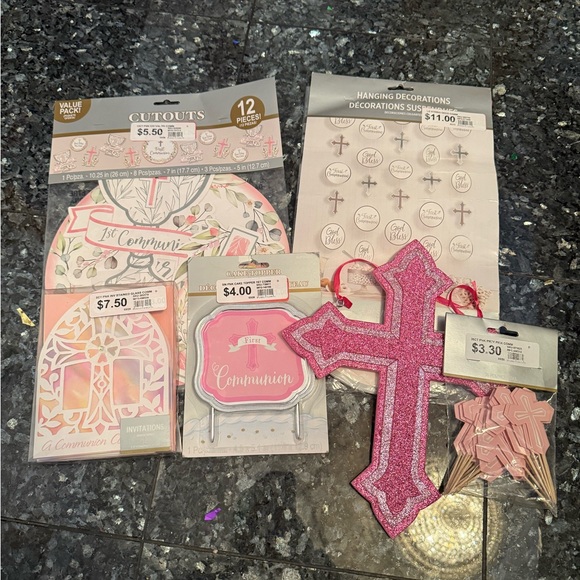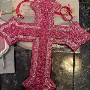 Assorted First Communion decorations. Includes a large pink glitter cross, pink cross cake toppers, pink communion signs, and coordinating cutouts. Bright pink accents throughout. Perfect for a themed celebration.