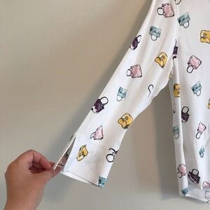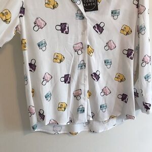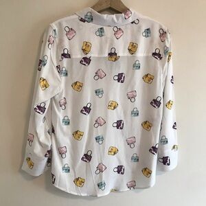 Features: white Button Down Top, Purse Handbag Graphic Print, long sleeves.