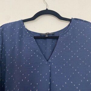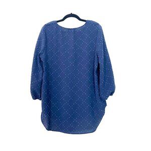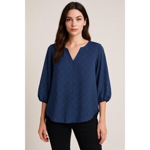 This stylish navy blue blouse features a textured dotted Swiss fabric, adding visual interest and a touch of elegance. The V-neckline and 3/4-length sleeves create a flattering silhouette, while the slightly longer back hem provides extra coverage. Photo is for reference only.