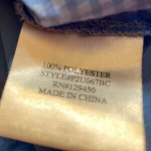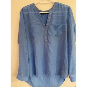 This Como Black women’s blouse in size L features a lightweight, semi-sheer fabric with a subtle check pattern. Designed with a V-neck Henley-style placket, long sleeves with button cuffs, and a curved high-low hem for a flattering drape. The sheer blue fabric looks great layered over a white cami for a chic, breezy style that works for both office or casual wear. Excellent pre-owned condition with no flaws noted.