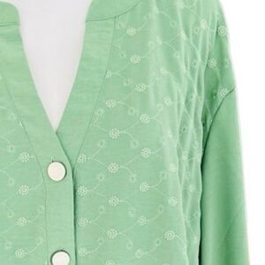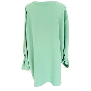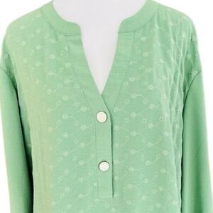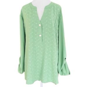 Como Black Women green split neck top with embroidered floral front size 3X. Split neck with two gold buttons in front, tab sleeves with gold buttons can be worn up or down. Floral embroidered pattern in front. 100% polyester.