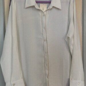 Simple yet elegant, crochet detail makes this blouse a standout! Airy summer weight button down can be dressed up or down, even wear as a coverup on the beach! PTP 22", 27" sleeve uncuffed, 29" Length. NWT, please see photos for additional info.