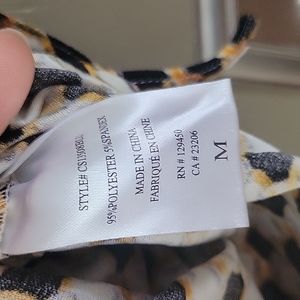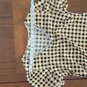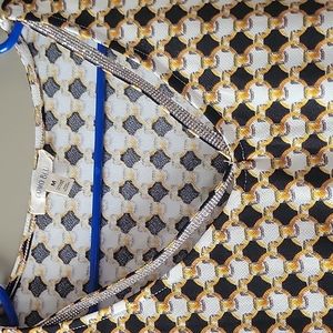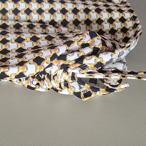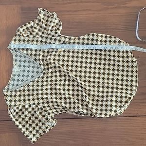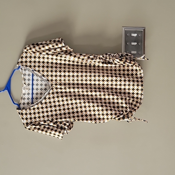 Como Blu blouse with ties at the bottom on each side. The shirt is a little baggy for me and I don't like the way the v-neck hangs. Only wore one time. Black, gold, white.