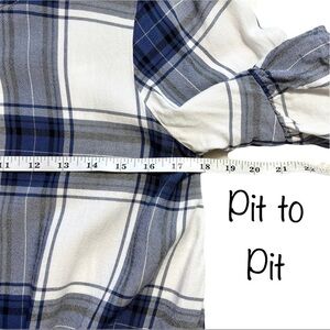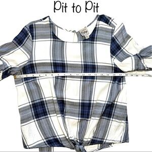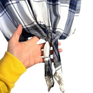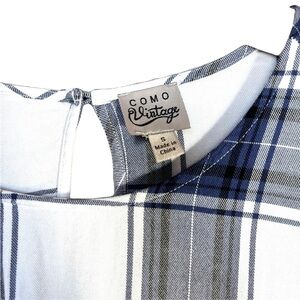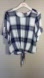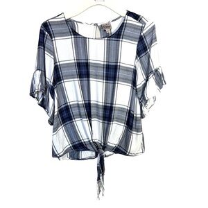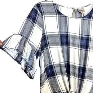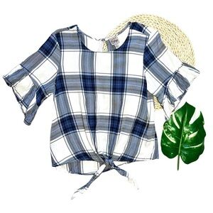 Como Vintage Blue and White Plaid Flutter Ruffle Sleeve Front Tie Top Size Small