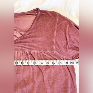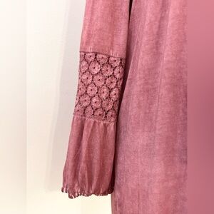 Chic dusty rose blouse. Features lace sleeve accents. Intentional distressed look at sleeve and chest.