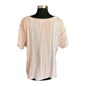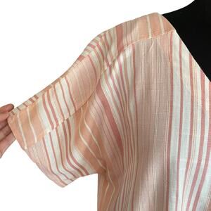 Como Vintage Linen Blend Button Down Tie Front Top Stripes Size XXL Casual Summer Breezy. Pink and cream vertical stripes on button down, collarless, V-neck top. 80% rayon, 20% linen. In excellent preowned condition.