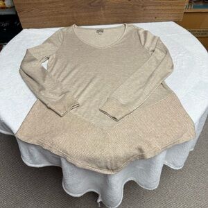 This blouse features a relaxed fit with a unique hemline, crafted in a soft tan fabric. Its long sleeves and lightweight drapey quality make it perfect for a casual, chic look. Very soft (5)