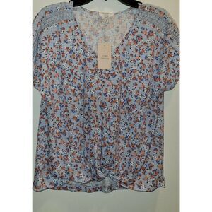 Como Vintage Blue Floral Knit Peasant Top Front Waist Knot Shirt XXl NWT