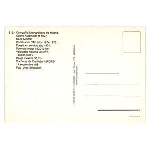 Photograph of vintage M-5027 CAF Series train by José Sebastián. Manufactured 1974-1976 for Madrid Metro with detailed specifications on reverse. Captured September 14, 1981.