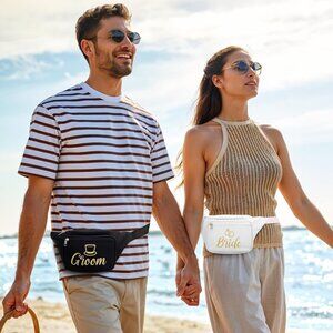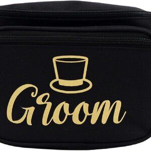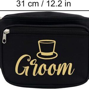 Features: This fun and practical fanny pack features a sleek black polyester design with a stylish "GROOM" patch. It’s perfect for bachelor parties, weddings, or honeymoon travel, keeping essentials like your phone, wallet, sunglasses, and more close and hands-free. The adjustable strap ensures a comfy fit, whether worn around the waist, crossbody, or over the shoulder. Includes multiple compartments—two inner pockets, a secure zipper pocket, and a mesh pocket for easy organizing. Water-resistant material keeps your belongings safe no matter the adventure.