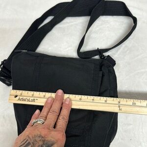 This sleek black messenger bag is crafted from a durable fabric, offering a stylish and practical solution for carrying essentials. Its compact design and adjustable strap make it perfect for everyday use, ensuring comfort and convenience on the go. 2 of the side pocket have felt like material (thinking concealed) see all photos as they are part of description