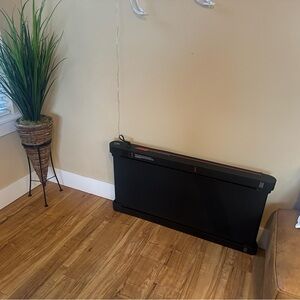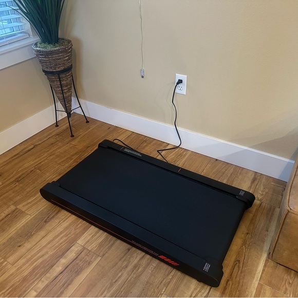 Sleek black treadmill for home workouts. Compact and easy to store.
