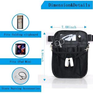 Features: This durable nylon fanny pack is designed specifically for nursing and medical pros. It has 10 pockets, including mesh, zip, and deep compartments, perfect for holding stethoscopes, phones, bandages, and more. The water-resistant fabric keeps your supplies protected and the slim, ergonomic design fits close to your body, making it comfy and unbulky during long shifts.
