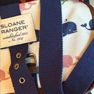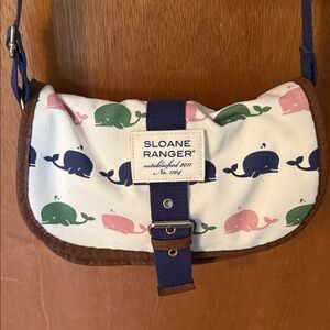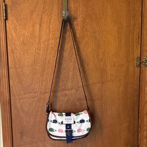 Compact Blue and White Crossbody Bag with Geometric Design