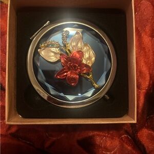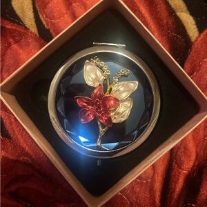 Blue jeweled compact (double mirror) with pink jeweled flower
