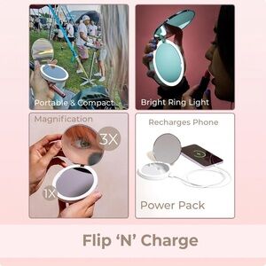 Elegant compact mirror with LED display. Features a sleek design in light pink and silver.