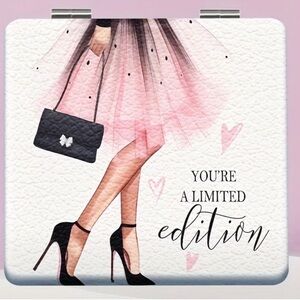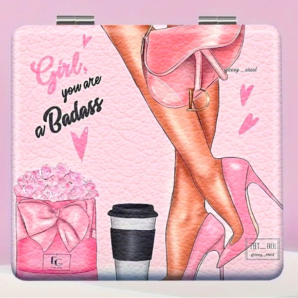 Stylish pink compact mirrors with 'Girl, You Are a Bada**' and “You’re A Limited Edition” designs.