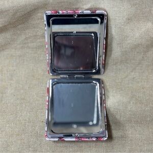 Stylish compact mirror with a styled with a makeup pattern. Features lipsticks, brushes, and more.