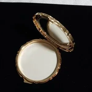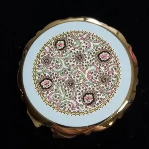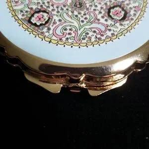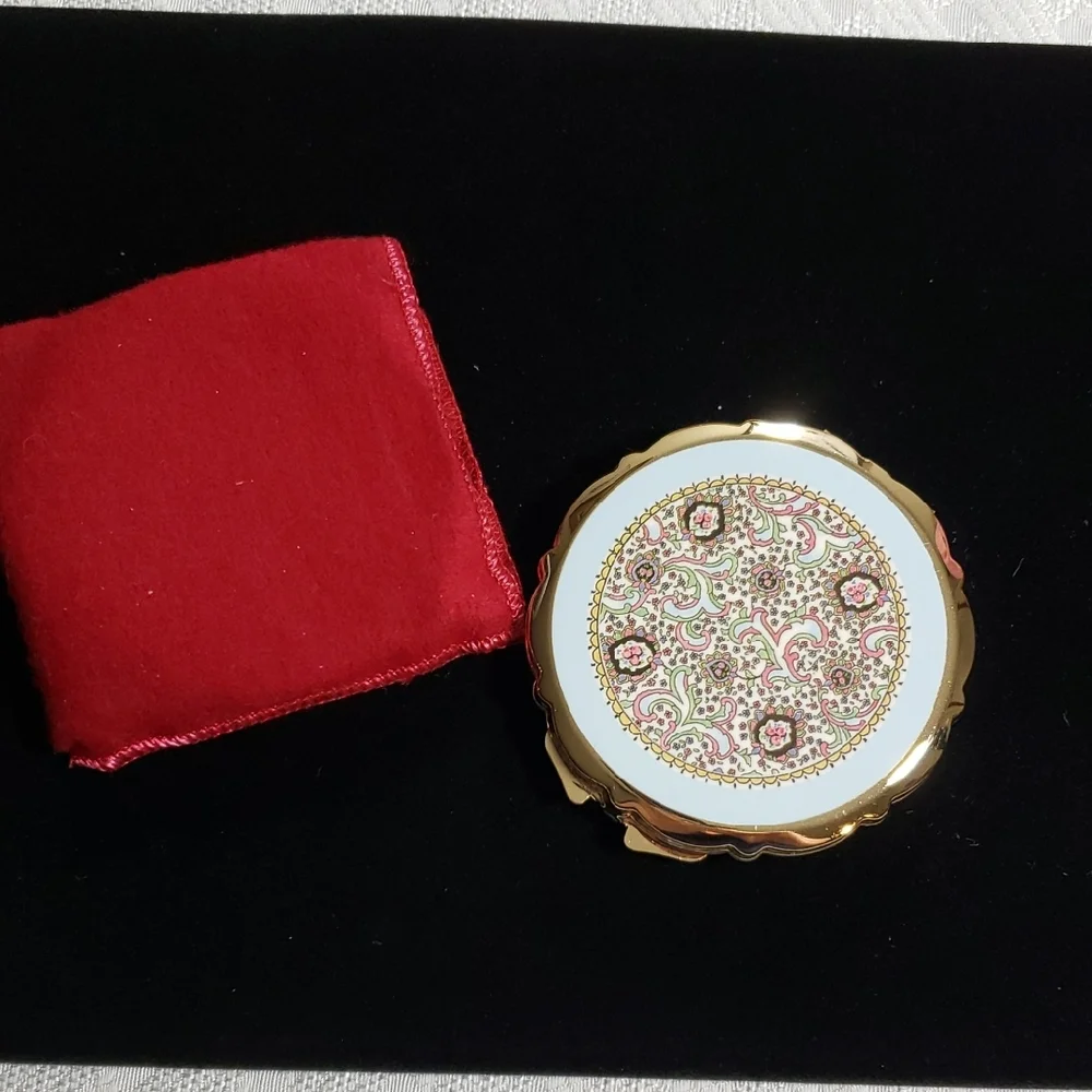 Lovely round metal compact with floral decorated top, has a well for powder and mirror inside. 3" across, iunused preowned. Made in Japan in vintage style, comes with a felt pouch.