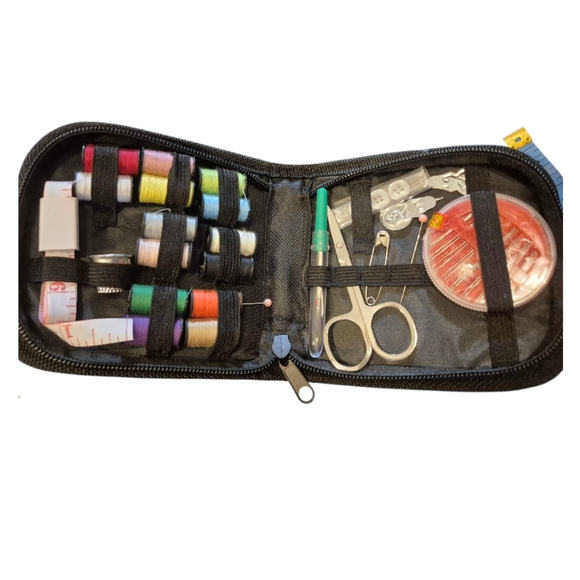 Portable sewing kit with multicolor threads, scissors, and essential tools. Perfect for quick repairs and travel.