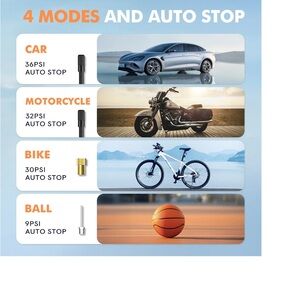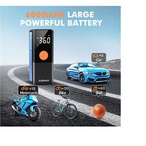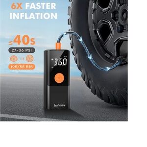 Portable tire inflator featuring a digital display. Sleek black design with orange button. Perfect for cars and bikes.