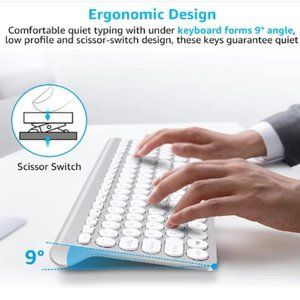 【Slim & Ergonomic Design】 The slim keyboard has a tilt angle for great typing position. Sweat-resistant, skin-friendly finish wireless mouse in contoured shape provides hours of work comfortably, with numeric keypad and instant access to music, internet, e-mail, volume, etc by multi-media hot keys.