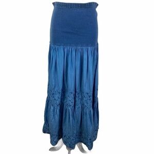 Vintage Compagnie BX Women's Large/Medium Blue 3-Piece Boho Maxi Skirt Set. Skirt is Medium and Shirt is Large. Embroidered floral long sleeve button down shirt with chest pocket with crew neck embroidered t-shirt underneath. Shirt can be worn open or buttoned. Full skirt has elastic panel over waist. Smoke free home. Great Condition.