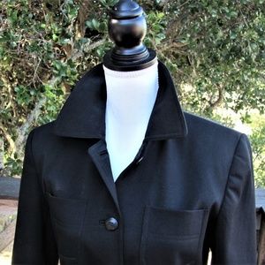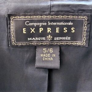 This is a Compagnie Internationale Express, Marque Deposee, black coat, jacket, dress. States 5/6 size. Is fully lined; Poly, Lycra and spandex mixture. Dry clean only. Has 4 pockets in front, 5 buttons and is a little stretchy. Very well made!! Only flaw I see, is a little wear on the back of the collar (last pic). I have not dry cleaned this, so that may come out with a cleaning. Great as a coat or even a dress.