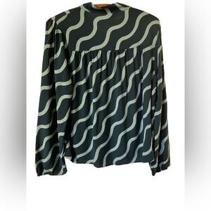 Spanish brand Compania Fantastica squiggly line blouse. Dark green with light blue squiggly pattern.