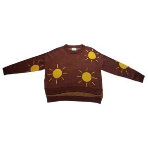 Great Preowned Condition! Size Small. Please see photos for measurements. Chocolate Brown with Yellow Suns. Crew neck. Hi Low Hem with side slits. Dolmen sleeve style. 100% Acrylic.