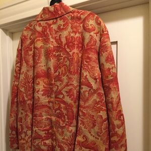 Burnt orange paisley pattern design on tan background. Fabric is 100% linen with seam down the middle of the back and darts to shape jacket. Three quarter sleeves with lapel collar. (Shell pictured is for sale in my closet)