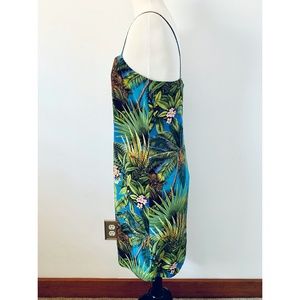 100% Silk Tropical Print Sundress.  Sheath style, fully lined, hidden back zipper.  Size 8 measures 18" across bust and is 37" long measured from shoulder.  Beautiful vibrant print with a background in shades of blue and turquoise.