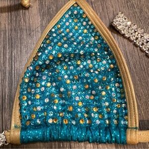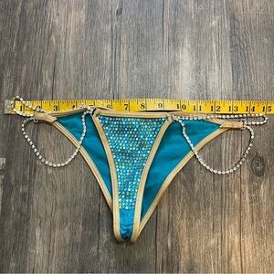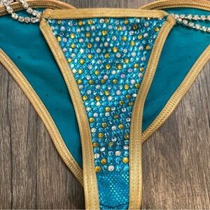 Beautiful and stunning turquoise competition bikini suit with gold and white rhinestone crystals. Top is size small A or B cup straps are adjustable. Pictures don’t do Justice, it’s an stunning piece.