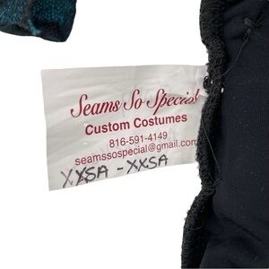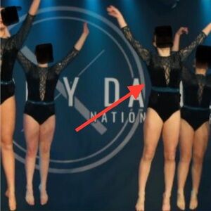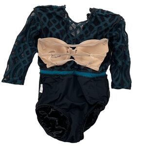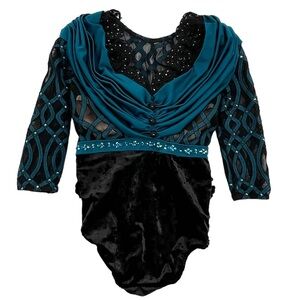 One-piece leotard in black "velvet" with 3/4 mesh sleeves and teal satin accents + hand-glued rhinestones throughout. It also has a built-in bra as shown in photos.